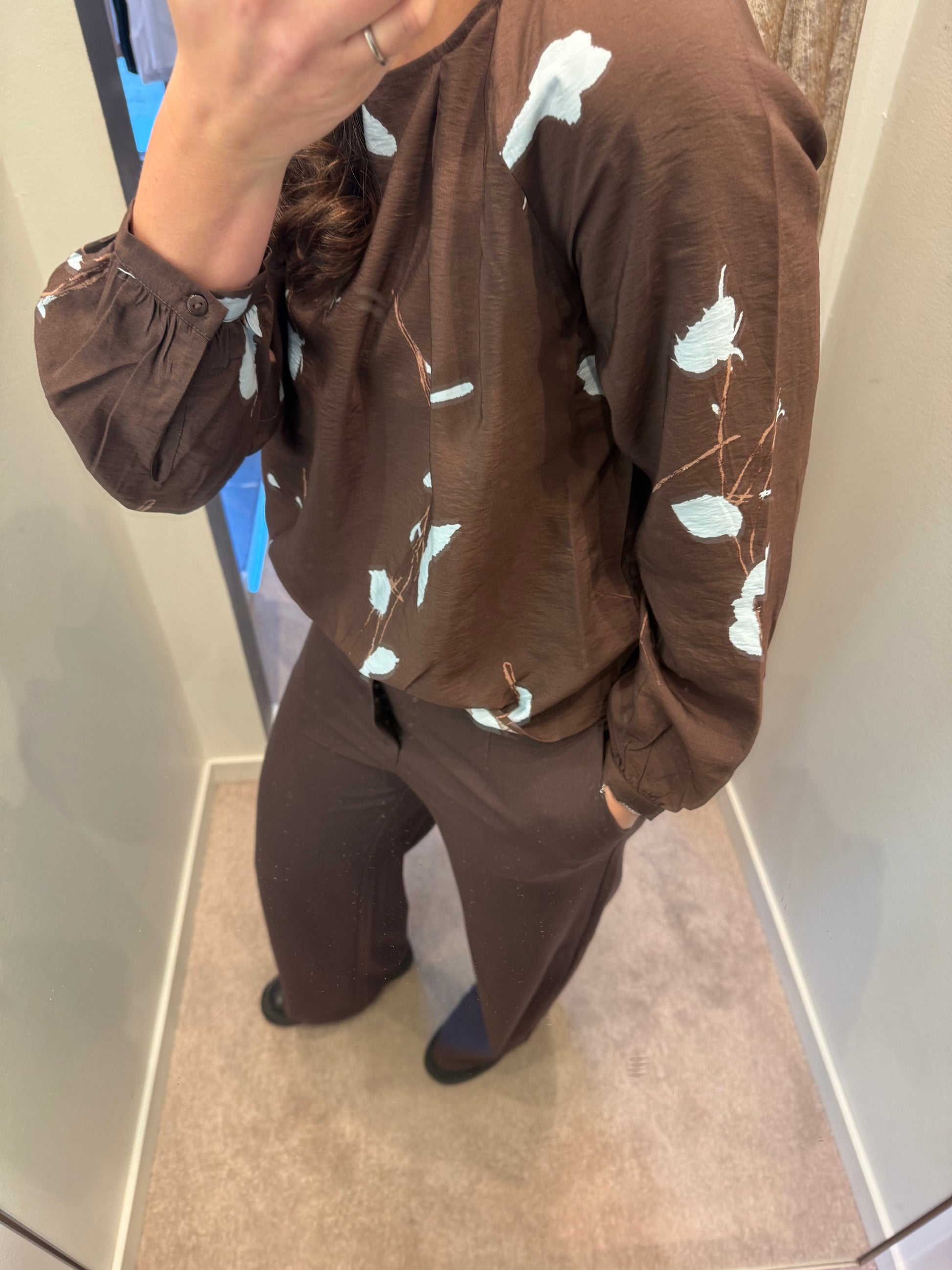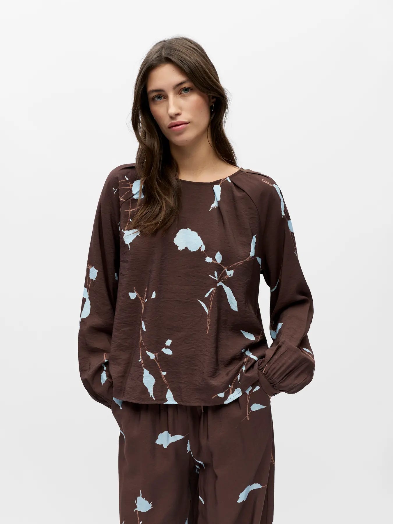Mönstrad blus från Object i chokladbrunt med blått mönster.
