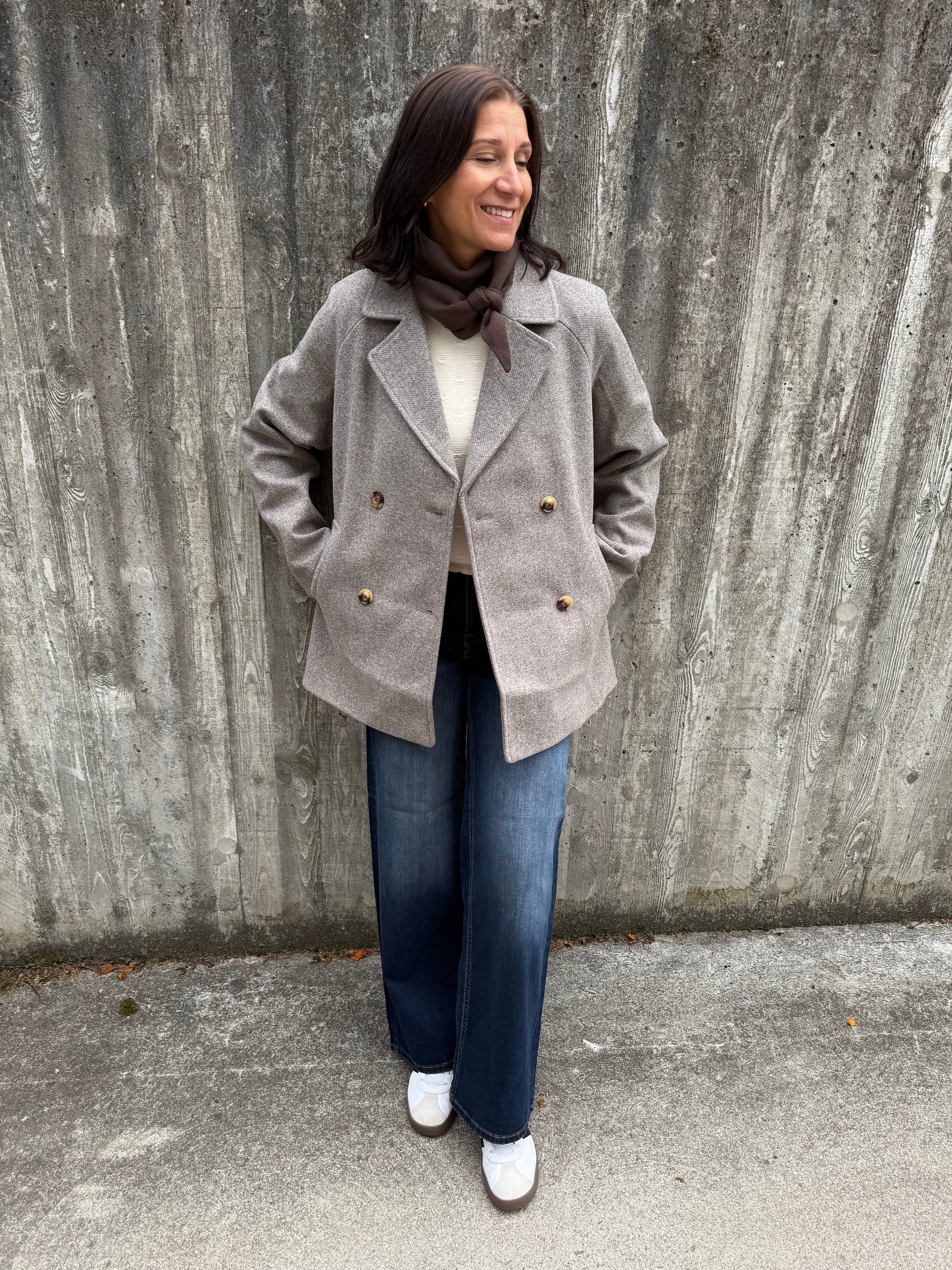 Debbelknäppt, raglan ärm och fickor i sidorna.