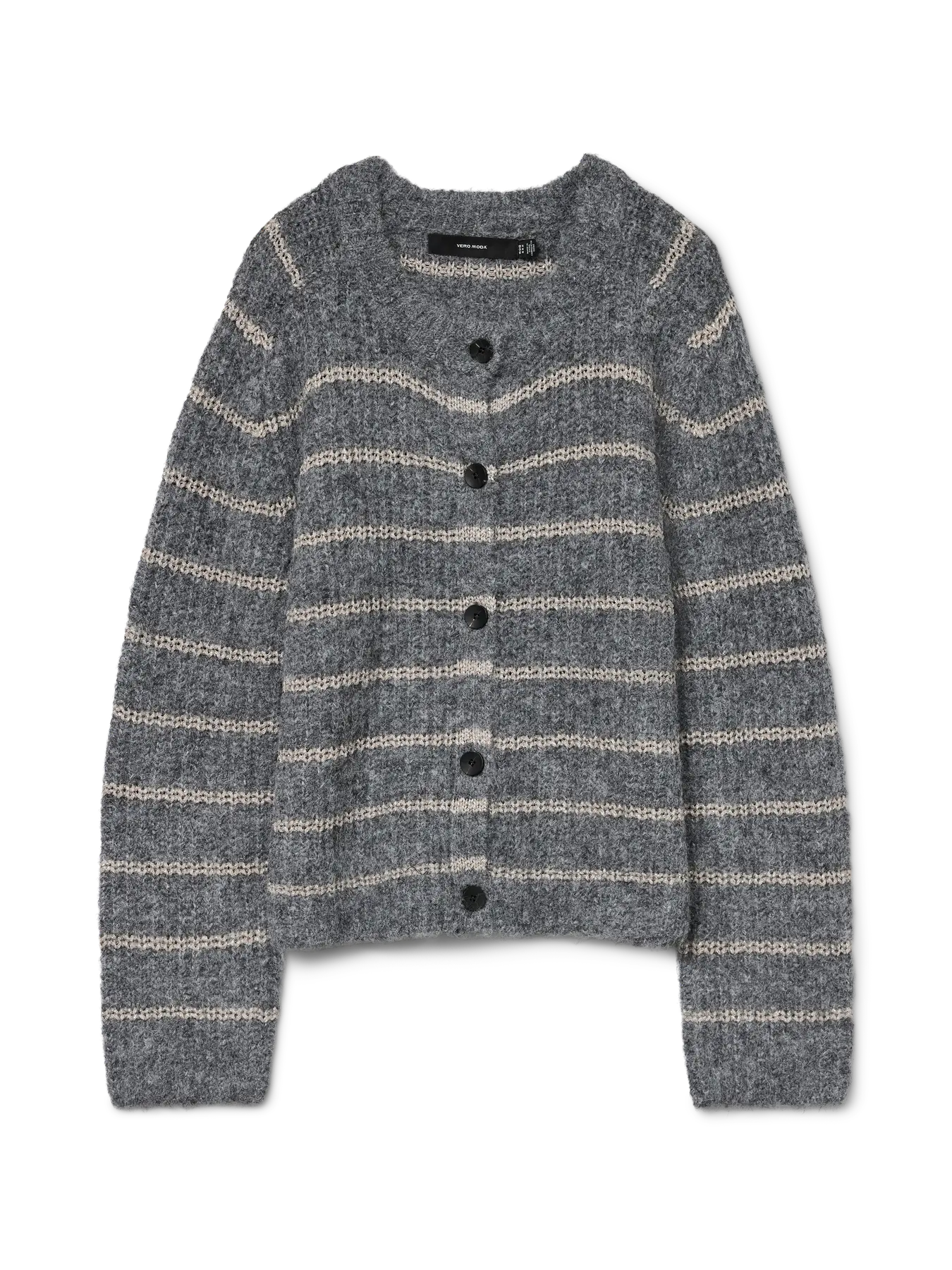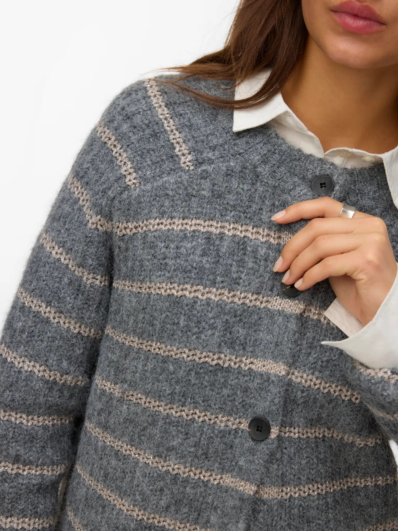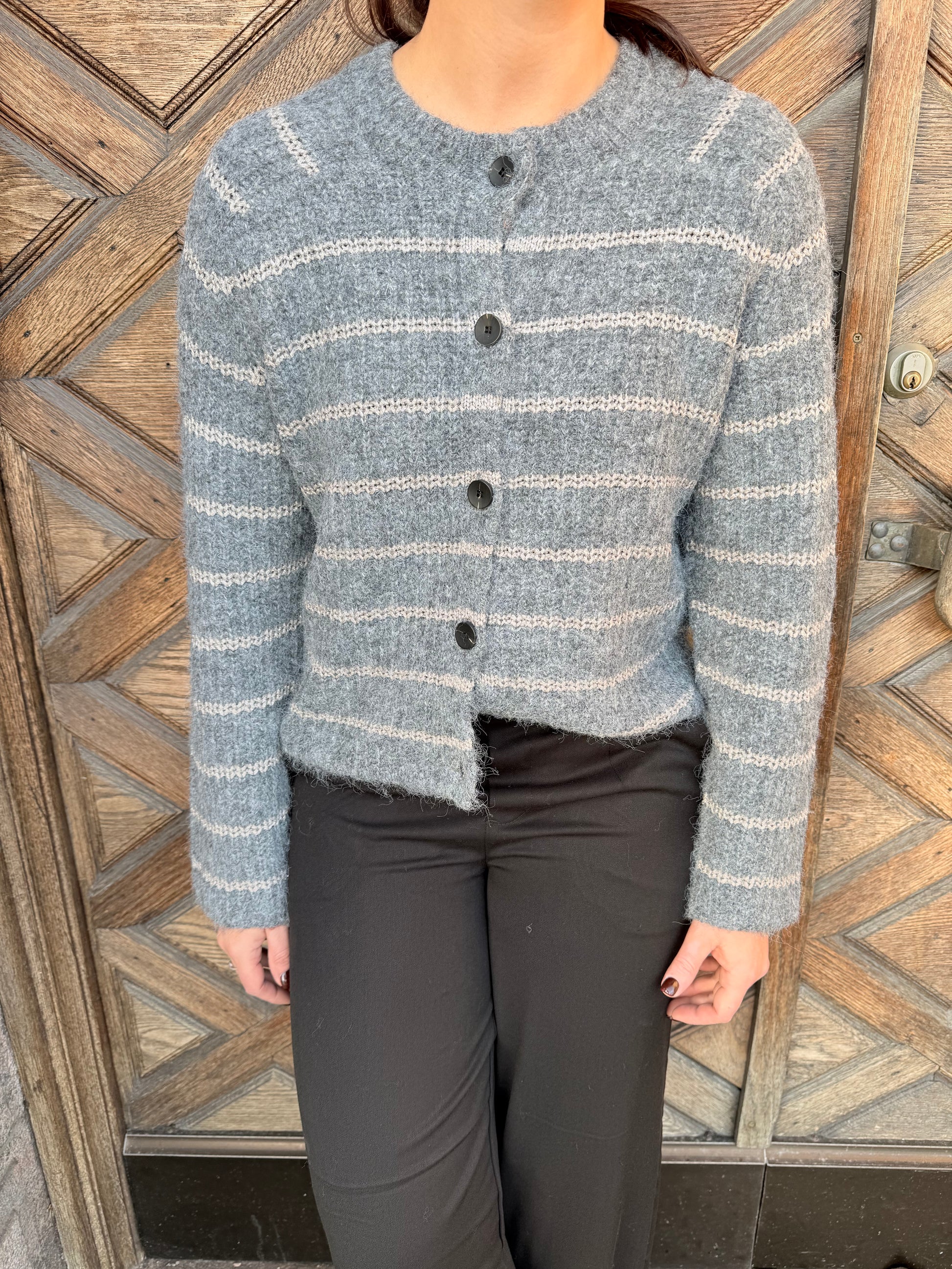 Grå stickad kofta med lurextrådar och svarta knappar.